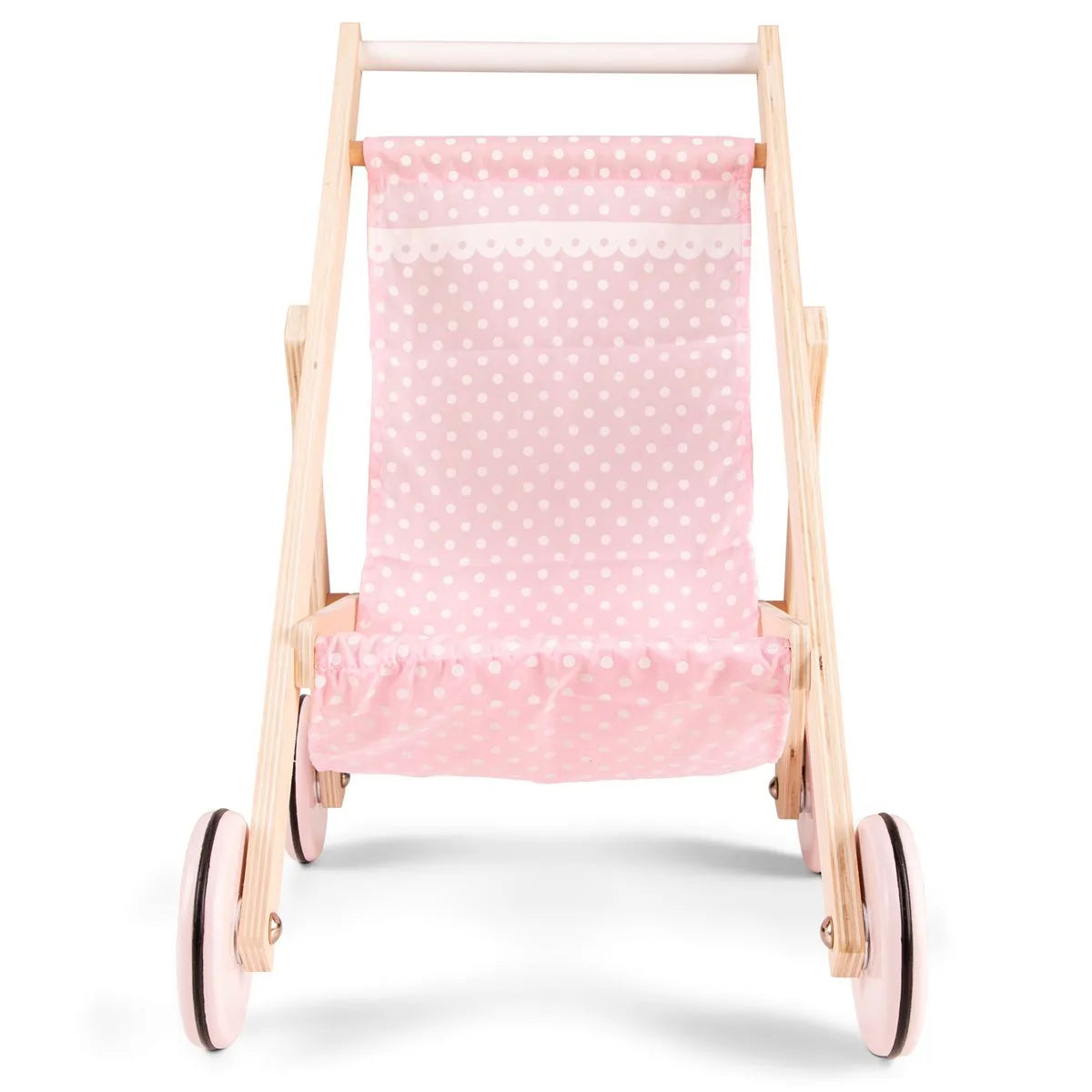 Met de Woet® houten poppenwagen kan je kind zijn favoriete pop of knuffel overal mee naartoe nemen. Deze charmante houten buggy met roze stoffen zitting met stippen is stevig, stabiel en gemakkelijk voort te duwen.De poppenwagen is geschikt voor poppen en knuffels tot ca. 43 cm en heeft een duwhoogte van 50 cm, perfect speelgoed 3 jaar.