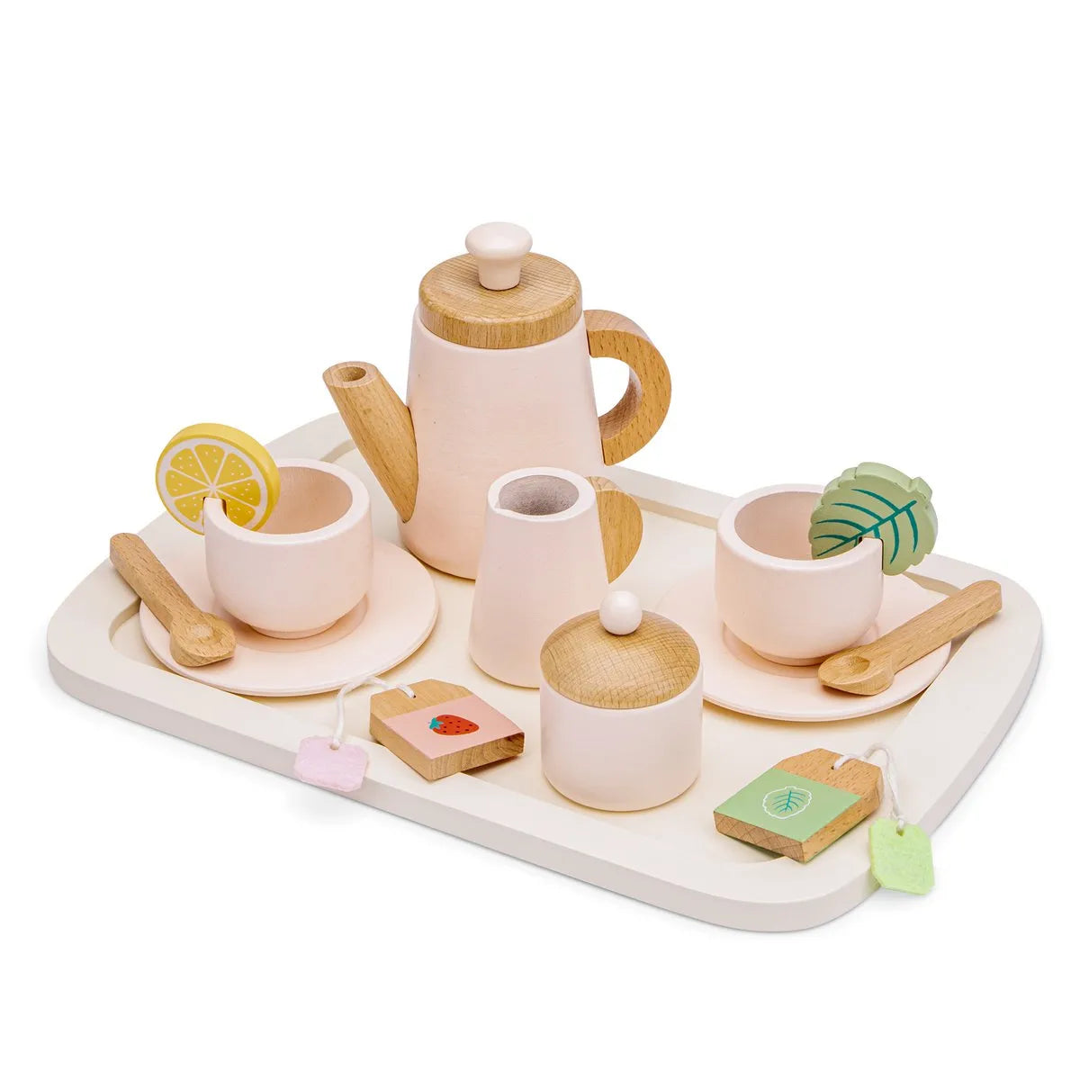 De set bevat alles voor een gezellig theekransje: een theepot met deksel, twee kopjes met schoteltjes, een melkkan, suikerpot met deksel, twee lepeltjes, twee houten theezakjes met illustraties, een schijfje citroen, een muntblaadje en een bijpassend dienblad. Tijdens het spelen en serveren, oefenen kinderen spelenderwijs hun fijne motoriek, creativiteit en sociale vaardigheden. Deze set tijdloze toevoeging aan elke speelkeuken of speelhoek - Speel smakelijk! Gemaakt van FSC® 100% gecertificeerd hout.