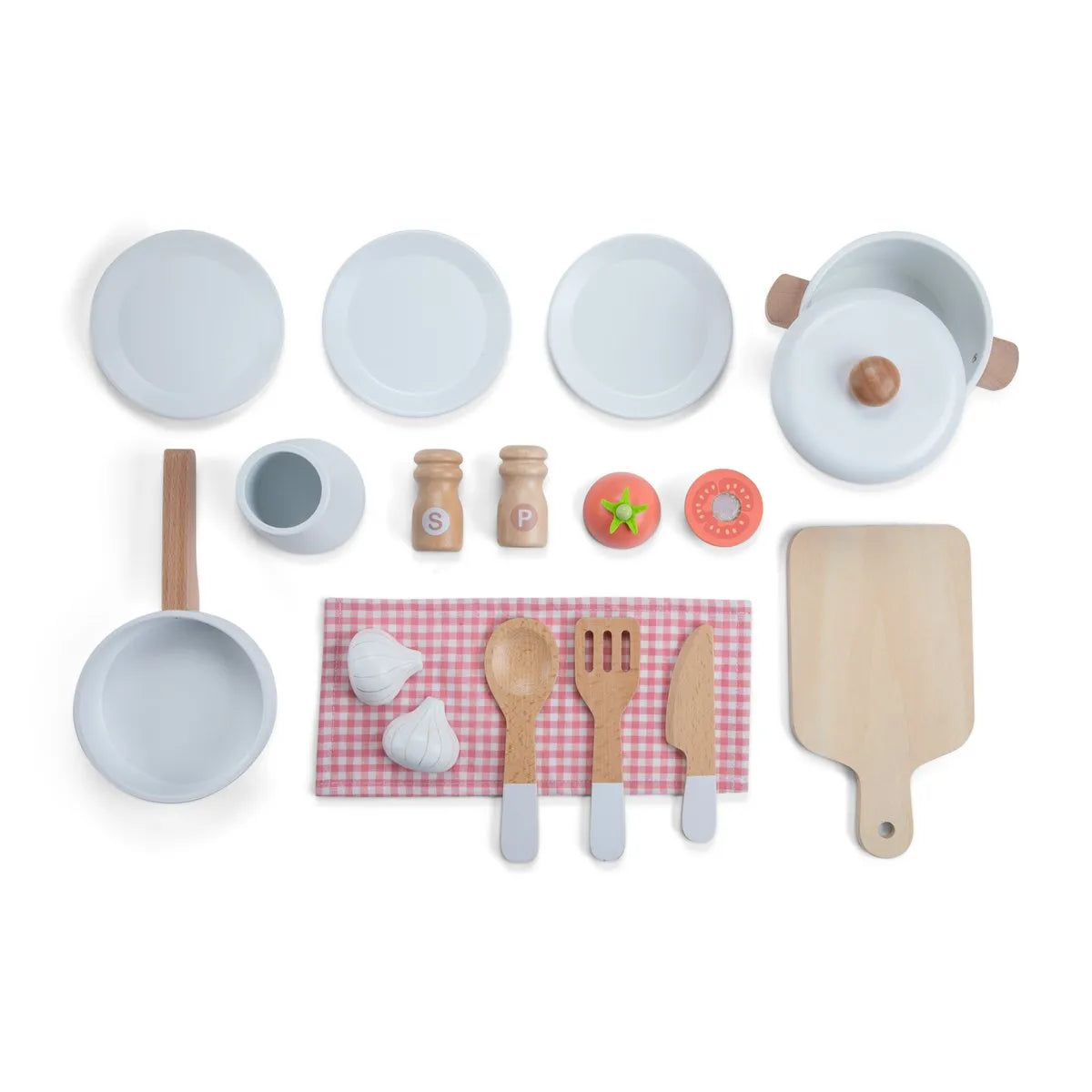 Een complete houten keuken met oven, kookplaat, wasbak en plank, inclusief de volgende accessoires: 3 borden, 1 koekenpan, 1 pan met deksel, 1 theedoek, zout- en peperstel, 1 snijplank, 1 tomaat, 1 knoflook, 1 mes, 1 lepel, 1 spatel en een pot om het keukengerei in op te bergen.